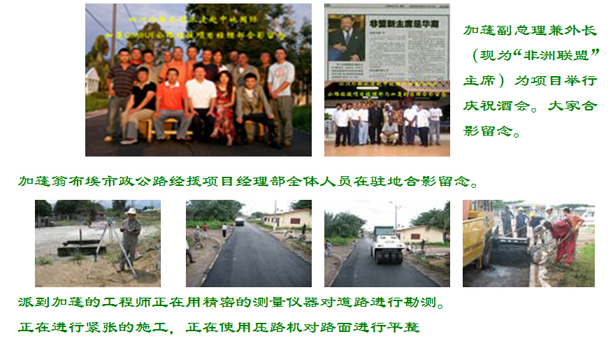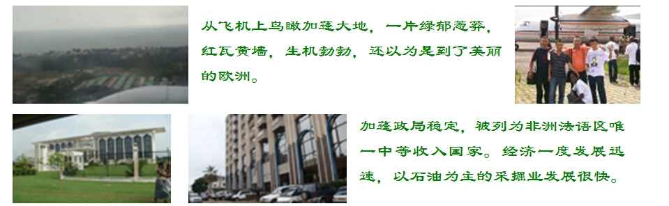 從飛機(jī)上鳥瞰加蓬大地,一片綠郁蔥莽,紅瓦黃墻,生機(jī)勃勃,還以為是到了美麗的歐洲。加蓬政局穩(wěn)定,被列為非洲法語區(qū)唯一中等收入國家。經(jīng)濟(jì)一度發(fā)展迅速,以石油為主的采掘業(yè)發(fā)展很快。加蓬年平均氣溫26℃,擁有豐富的森林資源,森林面積占全國土地面積的85%,被譽(yù)為非洲的“綠金之國”。加蓬的氣候很適宜植物的生長,美麗的出產(chǎn)的蔬菜瓜果品種繁多,真稱得上花朵,絢麗而多姿。加蓬副總理兼外長(現(xiàn)為“非洲聯(lián)盟”主席)為項(xiàng)目舉行慶祝酒會(huì)。大家合影留念。加蓬翁布埃市政公路經(jīng)援項(xiàng)目經(jīng)理部全體人員在駐地合影留念。派到加蓬的工程師正在用精密的測量儀器對道路進(jìn)行勘測。正在進(jìn)行緊張的施工,正在使用壓路機(jī)對路面進(jìn)行平整站在自己修建的馬路上,別有一翻滋味在海邊一處施工工地現(xiàn)場。