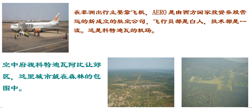 在非洲出行主要靠飛機(jī),AERO是由西方國(guó)家投資參股營(yíng)運(yùn)的新成立的航空公司,飛行員都是白人,技術(shù)都是一流??罩懈暱铺氐贤甙⒈茸尳紖^(qū),這里城市就在森林的包圍中。