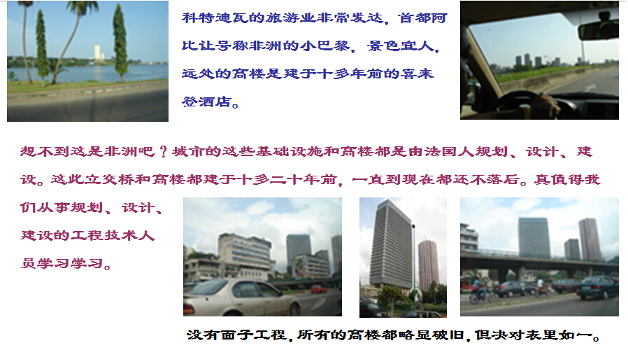 科特迪瓦的旅游業(yè)非常發(fā)達(dá),首都阿比讓號(hào)稱(chēng)非洲的小巴黎,景色宜人,遠(yuǎn)處的高樓是建于十多年前的喜來(lái)登酒店。城市的基礎(chǔ)設(shè)施和高樓都是由法國(guó)人規(guī)劃、設(shè)計(jì)、建設(shè)。立交橋和高樓都建于十多二十年前,一直到現(xiàn)在都還不落后。真值得我們從事規(guī)劃、設(shè)計(jì)、建設(shè)的工程技術(shù)人員學(xué)習(xí)學(xué)習(xí)。